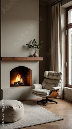 Fototapeta premium A comfortable living room with a warm fireplace and a single chair, perfect...