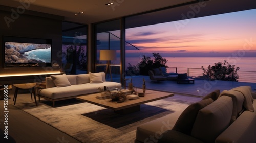 Fototapeta premium A comfortable living room with modern furniture and a large flat screen TV....