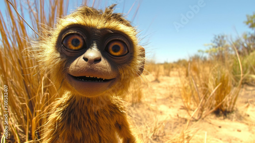 © sahar, Fototapeta premium A comical monkey figure in a sandy desert, looking at the camera