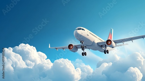 Fototapeta premium A commercial airplane flying through a bright blue sky with fluffy clouds, representing travel and freedom.