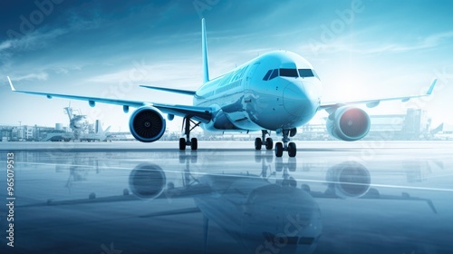 Fototapeta premium A commercial airplane sits on the tarmac, ready for takeoff. The blue sky and...