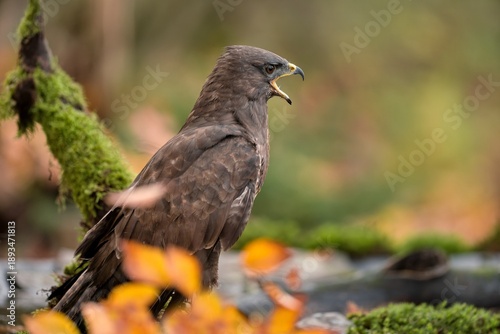 © Monikasurzin, Fototapeta premium A common buzzard sits on a branch. Buteo buteo. Closeup portrait of a common buzzard.