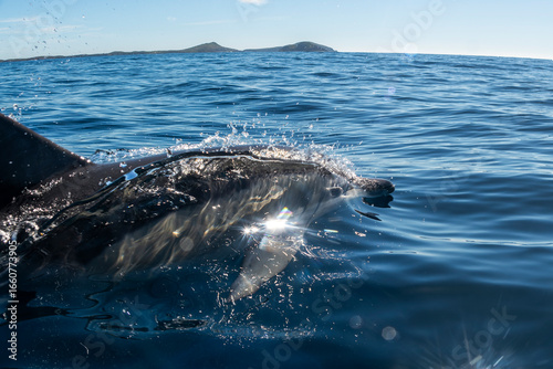 Naklejka premium A common dolphin swimming near the surface with sunlight reflections in Port Stephens, New South Wales, Australia.