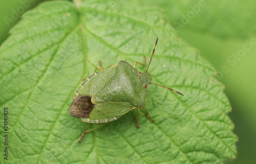 Fototapeta premium A Common Green Shieldbug (Palomena prasina) perched on a leaf.
