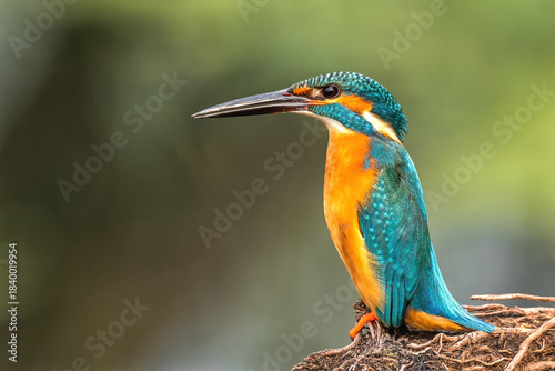 © Shubhrojyoti, Naklejka premium A Common Kingfisher (Alcedo atthis) perched on a tree branch in a green blurred forest background at Keoladeo National Park, Bharatpur, Rajasthan, India