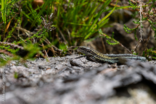 © Petr, Fototapeta premium a common lizard lying on a stone. Sand lizard. Lacerta agilis Linnaeus