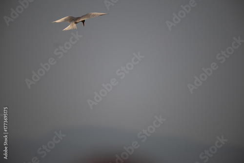 Obraz premium A common river tern in mid flight with its wings fully spread. The background...