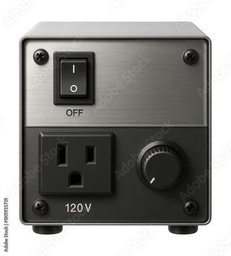 © OMD, Obraz premium A compact metal step-down transformer for basement workshop tools in a home.