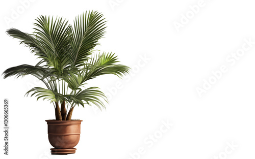 Fototapeta premium A compact potted palm tree with fan-shaped leaves, isolated on a empty plain...