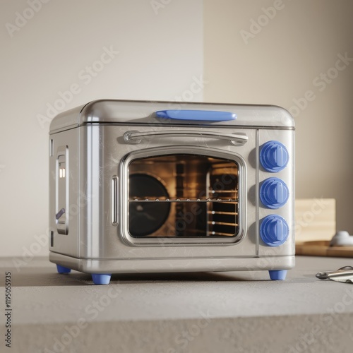 © Vibu design gallery, Obraz premium A compact, retro-style countertop oven with blue knobs, ideal for small kitchens or baking enthusiasts.