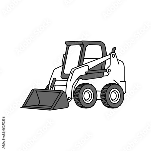 © aan, Naklejka premium A compact white skid steer loader with a front bucket is depicted in a clean, isolated graphic illustration on a white background.