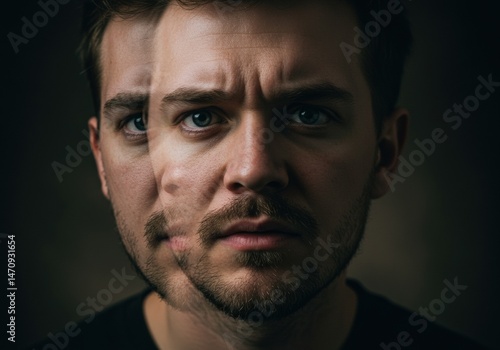 Fototapeta premium A compelling portrait depicts a split-face of a man, exploring duality and...