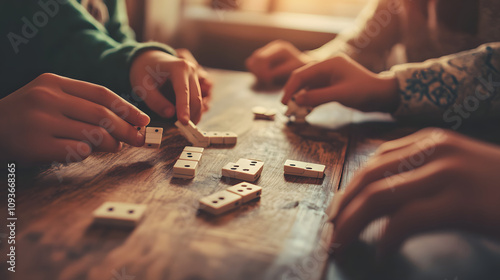 © Jochen, Obraz premium A competitive game of dominoes in progress with hands placing pieces on a wooden table.