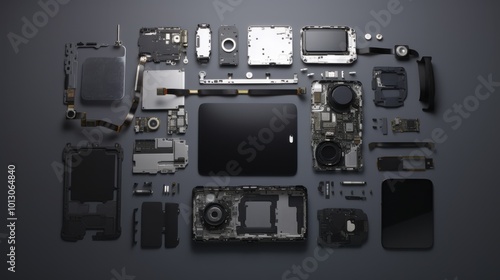 Obraz premium A complex array of disassembled phone components is meticulously arranged,...