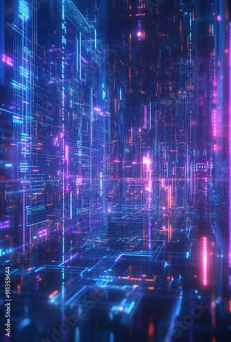 © Biru Langit Desember, Fototapeta premium A complex data visualization in a cyberpunk style, featuring interconnected blue and purple circuits, abstract data waves, and a high tech atmosphere