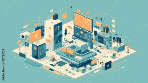 © Kuarinofu, Obraz premium A complex network of interconnected devices and data flows in a modern tech environment.