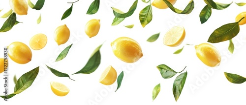 © Sri, Obraz premium A composition of lemons and leaves on a white background, emphasizing freshness and nature.