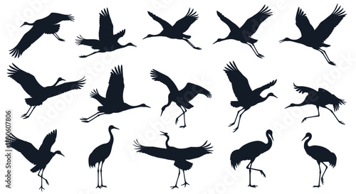 Fototapeta premium A comprehensive set of sixteen black silhouettes showing Japanese cranes in a...
