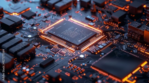 © liliyabatyrova, Fototapeta premium A computer chip is lit up in orange