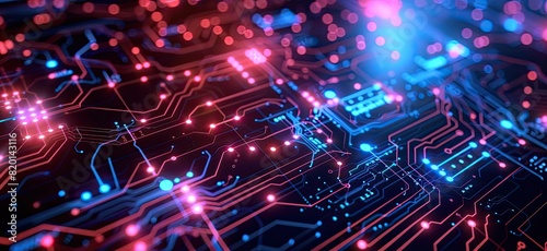 © Murda, Fototapeta premium A computer chip with a blue background and orange and red lines