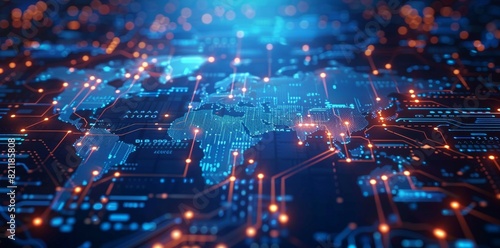 © Space Priest, Obraz premium A computer chip with a blue background and orange lines, World map