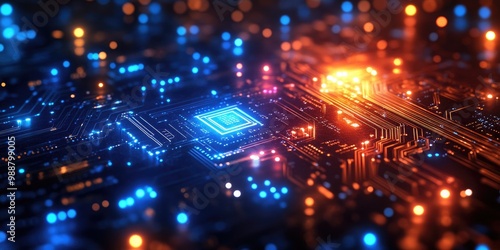 © Kartika, Fototapeta premium A computer chip with a blue square on it