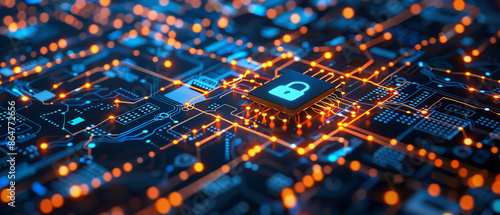 © Preeyakamol, Fototapeta premium A computer chip with glowing orange and blue lights.