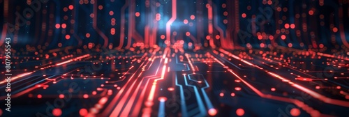 Fototapeta premium A computer circuit board with red and blue lights, AI