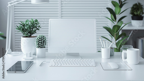 © CreativeIMGIdeas, Obraz premium A computer desk with a white monitor, keyboard, mouse, and a few plants