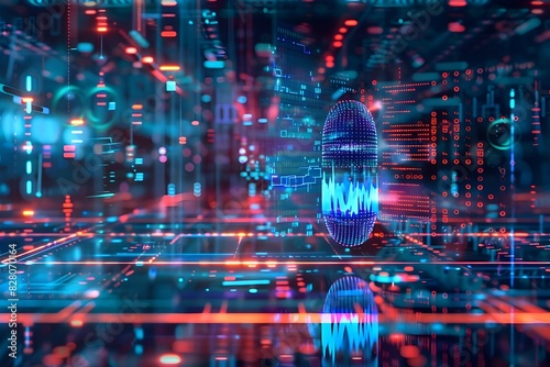© Juibo, Fototapeta premium A computer generated image of a blue and red sphere with a blue light on it. The image is of a futuristic cityscape with many lights and a lot of detail. Scene is futuristic and technological