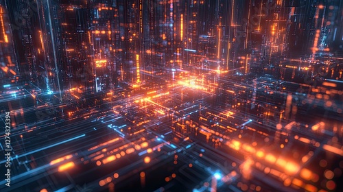 © SUNSU, Naklejka premium A computer generated image of a cityscape with bright orange and blue lights