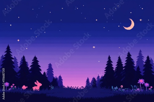 Naklejka premium A computer generated image of a forest at night with a rabbit and a deer, pixel art 8 bit