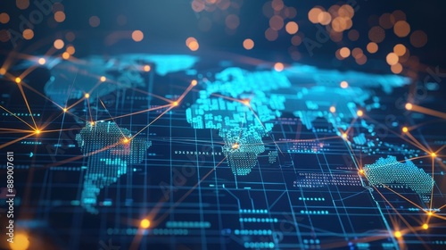 Obraz premium A computer generated image of a world map with many points of light. The image has a futuristic and technological feel to it
