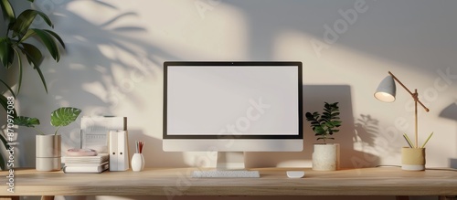 © chartchai, Obraz premium A computer monitor sits on a desk with a lamp and a potted plant by AI generated image