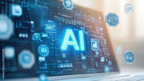 © Jaturong, Fototapeta premium A computer screen with a blue screen that says AI. Generative AI
