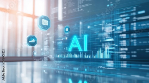 © Jaturong, Fototapeta premium A computer screen with a blue word that says AI. Generative AI
