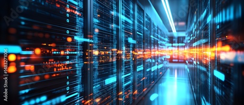 © SJarkCube, Obraz premium A computer server room with a blue and orange background