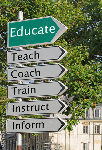 © Drew, Obraz premium A concept road sign pointing in the direction of 'Educate' with some descriptive words underneath