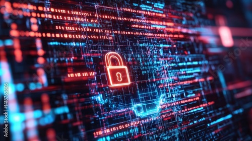 © wicha, Obraz premium A conceptual cyber security image with a digital lock embedded in a holographic shield, with matrix-like code and data encryption patterns in the background.