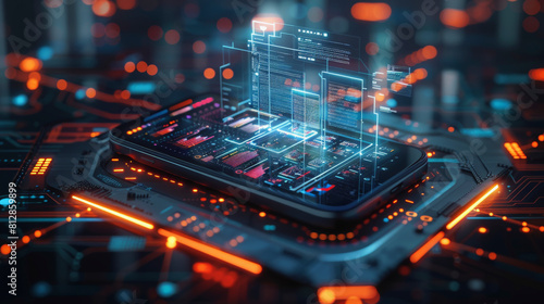 © Nano Photos, Obraz premium A conceptual digital illustration of a smartphone with a transparent view into its internal circuitry and processors, symbolizing advanced technology and computing power.