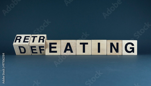 Obraz premium A conceptual image of wooden blocks spelling out the words Retreating and Defeating