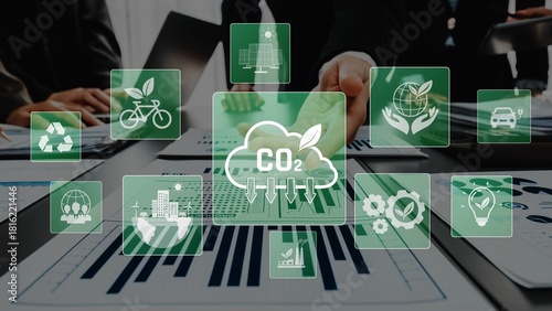 © InfiniteFlow, Naklejka premium A conceptual image showcasing various graphics related to environmental impact, carbon offset, and sustainable practices for a greener future in business strategies. Raster