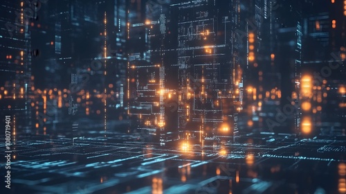 Naklejka premium A conceptual landscape of crumbling digital structures with glowing data...