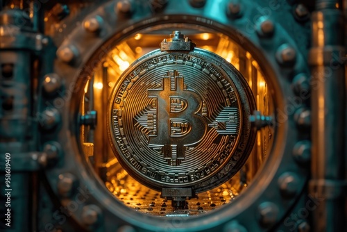 © Ninoshik, Fototapeta premium A conceptual photo of a cryptocurrency coin breaking through a traditional bank vault door, representing the disruption of digital currency in finance