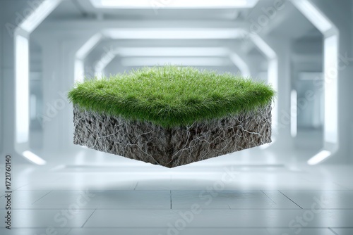 Fototapeta premium A conceptual rendering of a green patch of grass with visible soil, suspended in a modern, sterile white corridor, representing sustainability and environmental awareness.