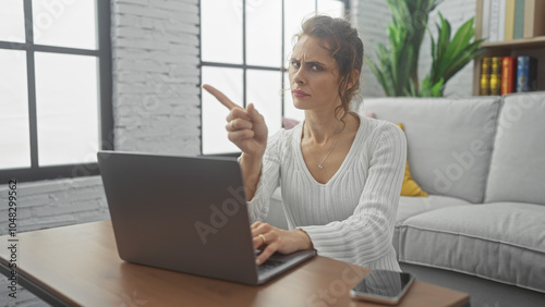 © Krakenimages.com, Obraz premium A concerned young woman points at a laptop screen while sitting in a modern living room, indicating an issue or question.