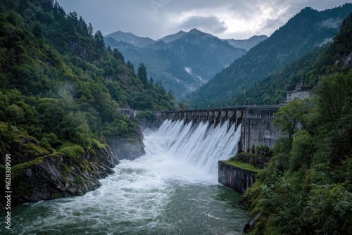 © Cherry, Fototapeta premium A concrete dam spills water into a rushing river nestled within a verdant, mountainous valley under a brooding sky