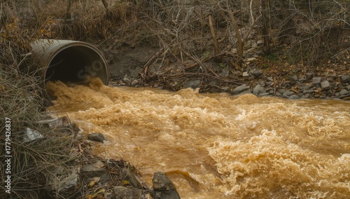 Obraz premium A concrete pipe discharges polluted water into a river, causing environmental...