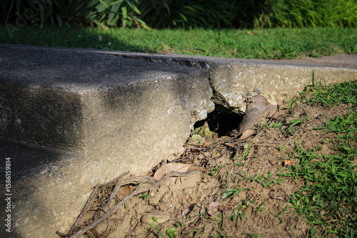 Obraz premium a concrete sidewalk with a crack, revealing a void below by the ground area.