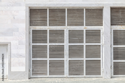 Fototapeta premium A concrete utility storage unit with two white doors is placed in a quiet...